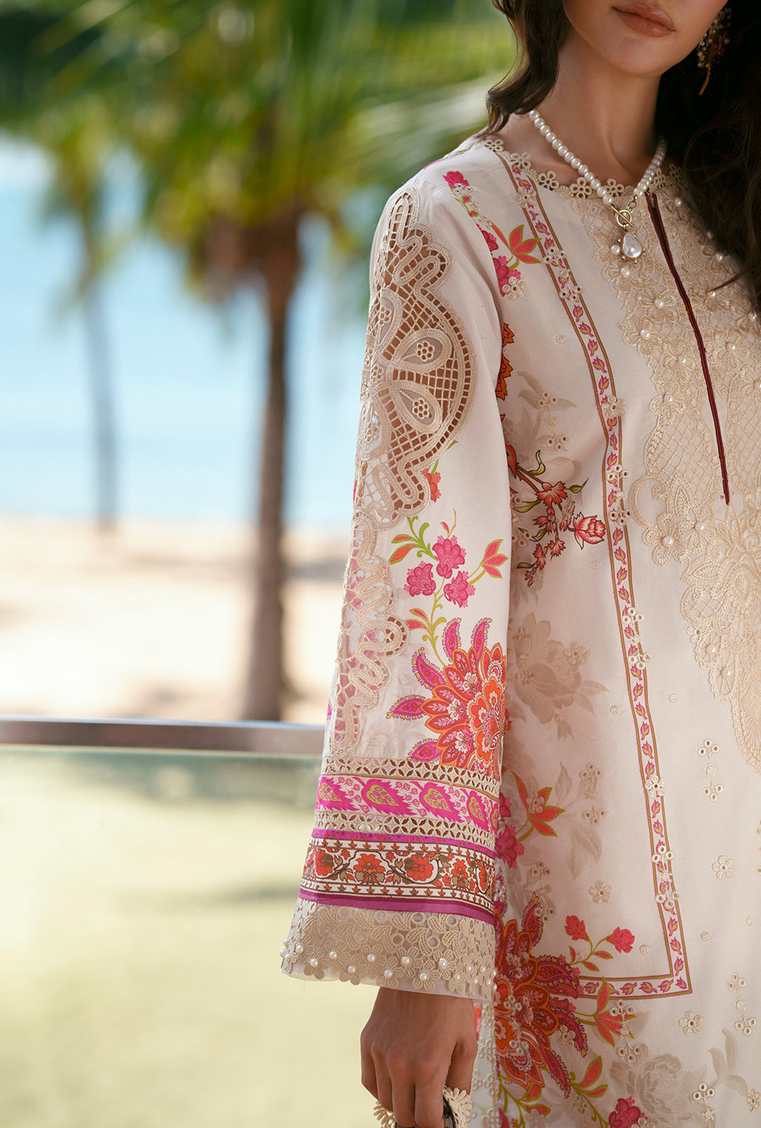 AIRA features a printed lawn shirt beautifully adorned with intricate Chikankari embroidery on the front, highlighted by an elegant embroidered neckline. Embroidered sleeve motifs and trouser borders add delicate sophistication, while printed lawn sleeves and back maintain a cohesive charm. Paired with dyed cotton trousers and a soft chiffon printed dupatta, this ensemble exudes timeless grace and refined elegance.