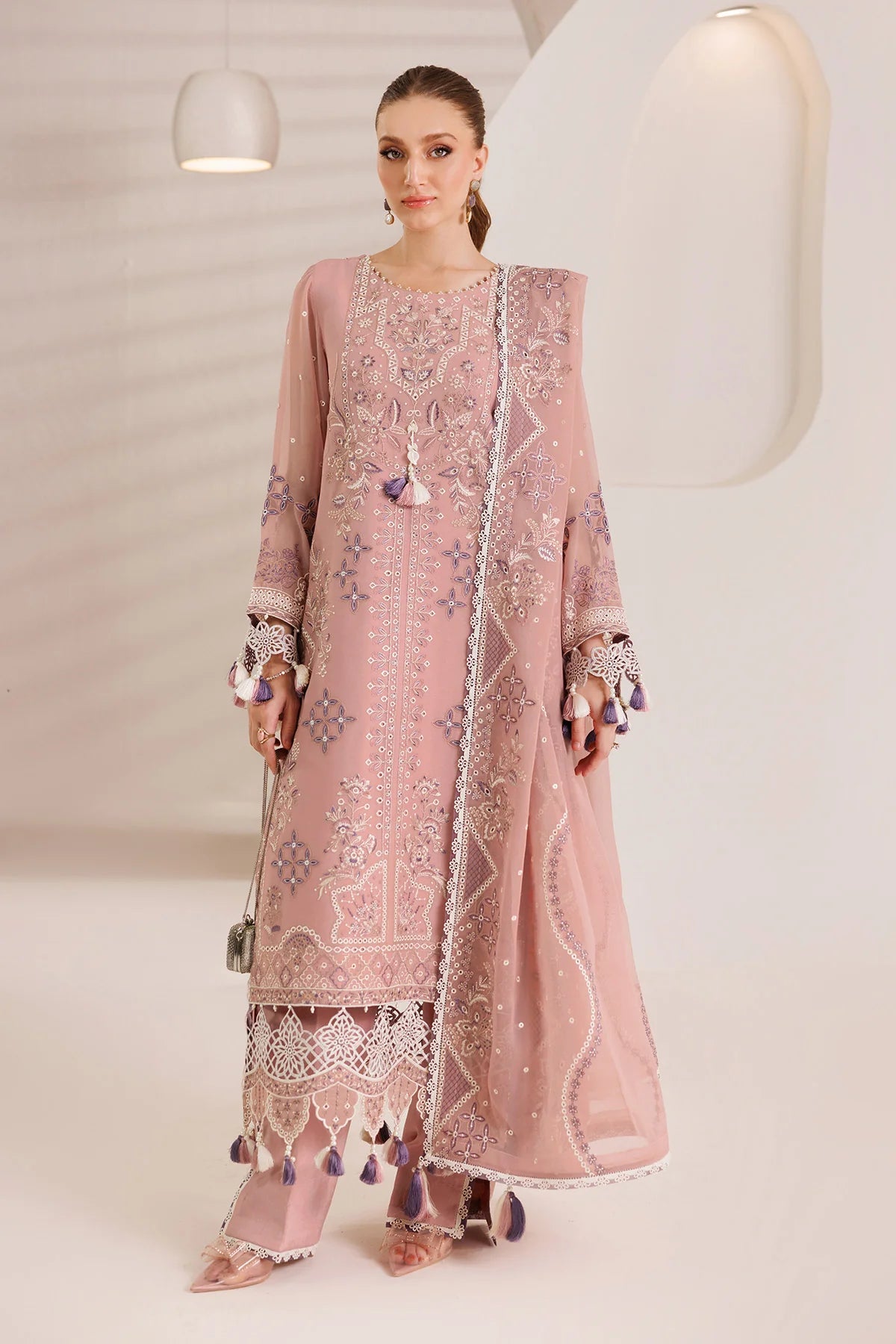 Elevate your wardrobe with Aabia from Alizeh’s Dhagay Vol 4 collection—a timeless peachy pink ensemble that radiates charm and elegance. This beautifully composed outfit features contrasting embroidery in white and purple on a chiffon shirt, designed with captivating motifs. The luxurious chiffon dupatta and dyed raw silk trousers create a complete look that blends modernity with traditional finesse.