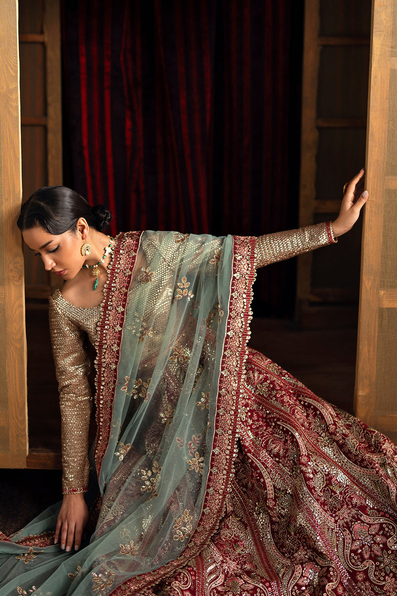 A richly detailed lehenga in deep crimson, adorned with intricate silver and antique-gold embroidery, creating a tapestry of florals and heritage motifs. The fitted, fully embellished blouse adds structure and radiance, while the soft sage dupatta — delicately accented with gold butis and scalloped borders — brings a gentle contrast to the ensemble.