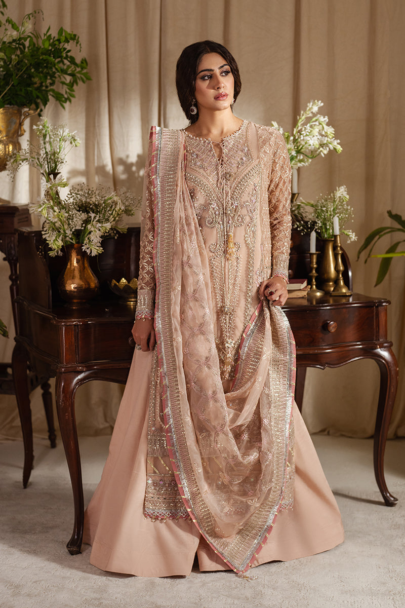 Bisma is a pastel straight front handworked shirt, featuring embroideries in pastel and same-tone shades depicting the floral patterns of ancient gardens. It is paired with a heavily embroidered dupatta, dyed raw silk slip and pants. Don’t miss out the most-awaited color of this season!