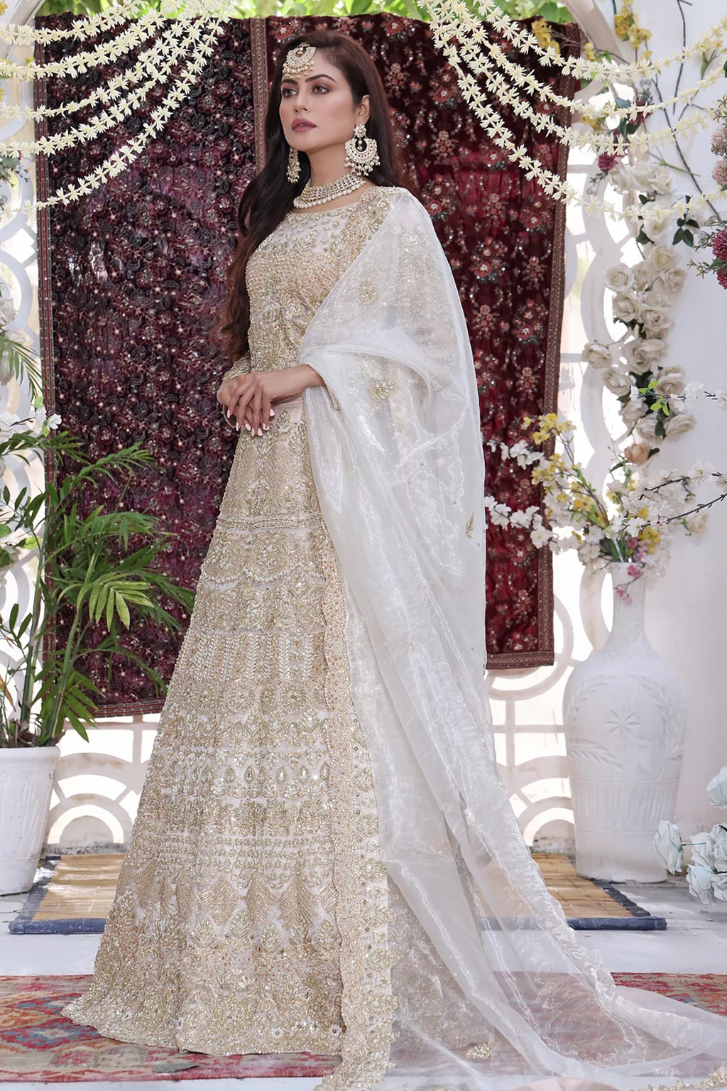 Description: The perfect shade for the season, this classical golden color base is subtle and pure yet will grab anyone's attention. The gorgeous is made in a rich organza lurex lehenga featuring a heavily embellished floral composition with a signature design crafted in pearls, beads, kora, and zari. Delicately bordered throughout the pipes on the hem . Adorned with a French organza dupatta and densely embroidered borders to achieve the desired bridal look.