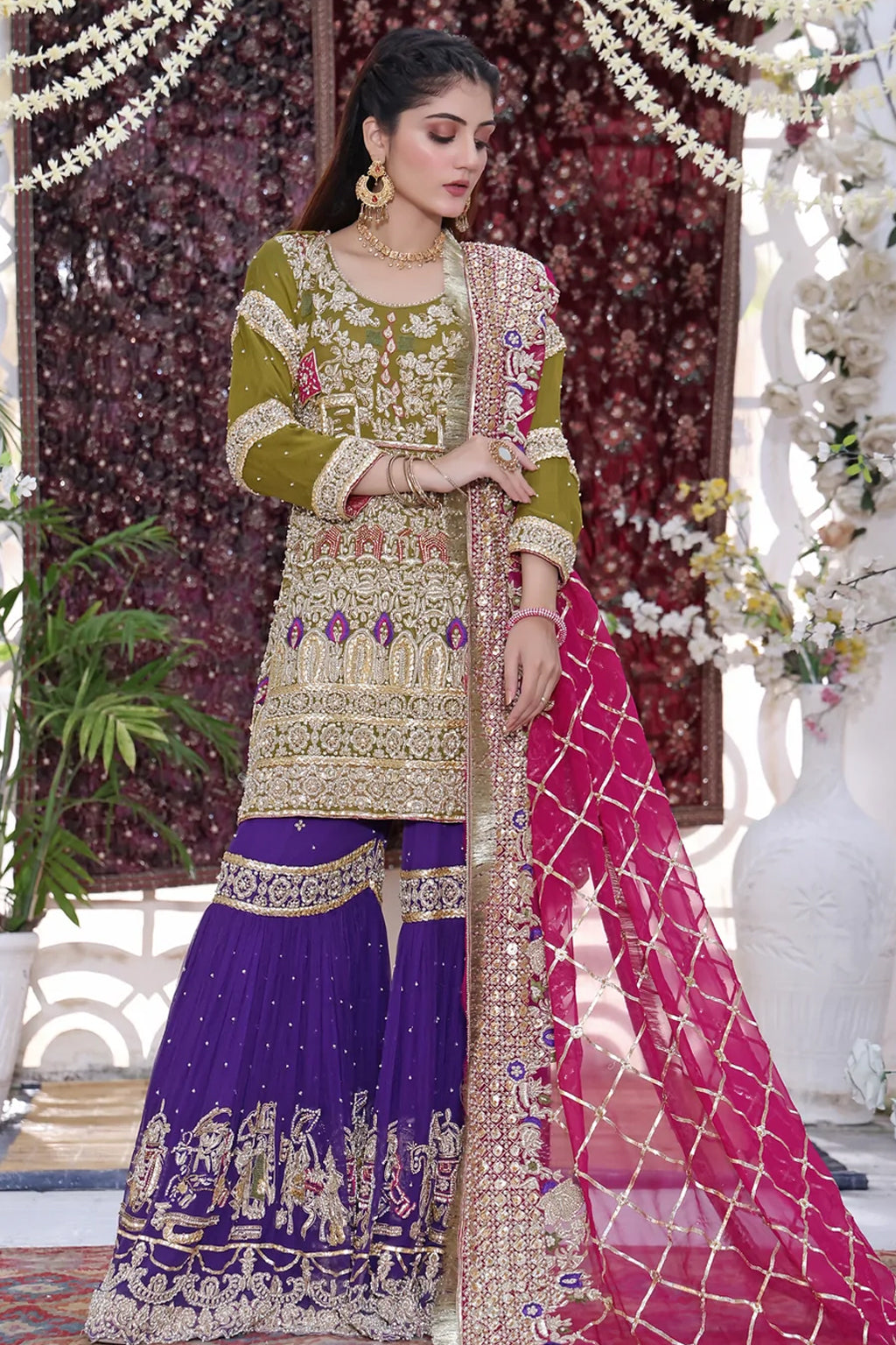 This stunning mustard peshwa has work, crystal, ada work and sequin embroidery on the bodice and all the panels. It is paired with heavy border embellishment with mustard sharara and four sided lace border with mustard pink chiffon dubata.