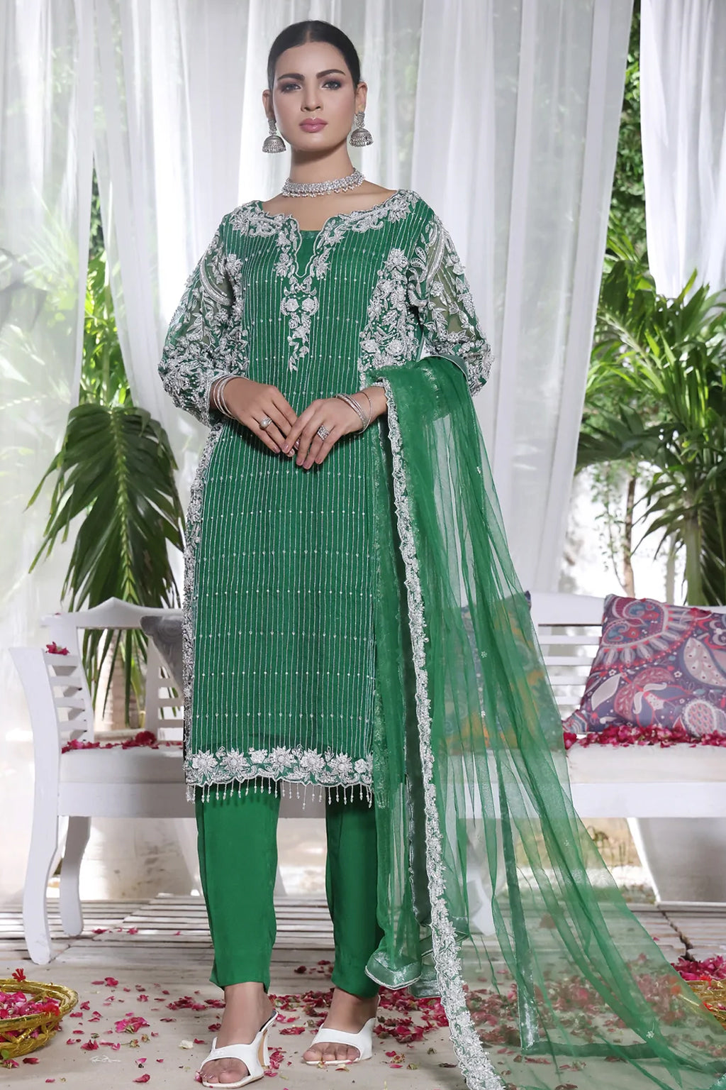 This classic green shirt has details of nakshi, sequins, embroidery made on a modern cut neckline that adds the right to this ensemble. It’s paired with straight pants styled with gorgeous duppata with handwork and pearl finishing all over.