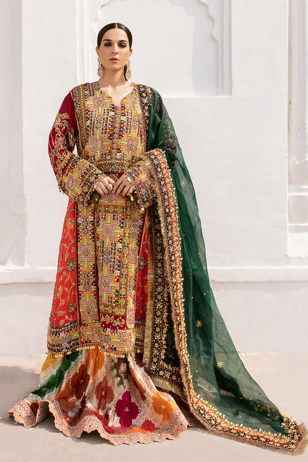 "Dive into the allure of bridal magic! ✨ Our dresses, a fusion of Balochi vibes, bring your wedding dreams to life. Sparkling with dabka, and crystal glam, each piece is a masterpiece. Wrapped in the luxe embrace of Tissue, Jamawar,raw silk ,and Organza, be the bride who steals the spotlight. 💫 Your love story, woven into threads of tradition and chic elegance. Say 'I do' in style!