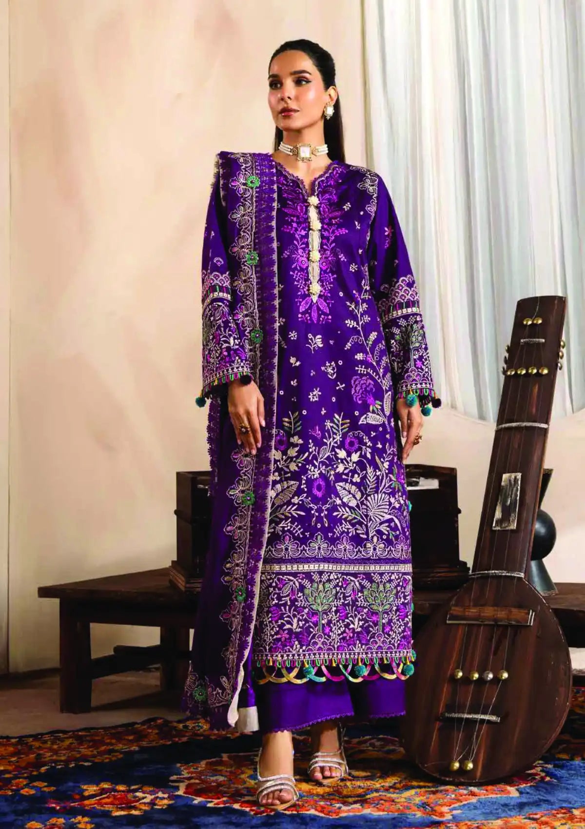 Perfect for winter gatherings, this ensemble blends luxurious texture with timeless embroidery, offering a statement look for the season.