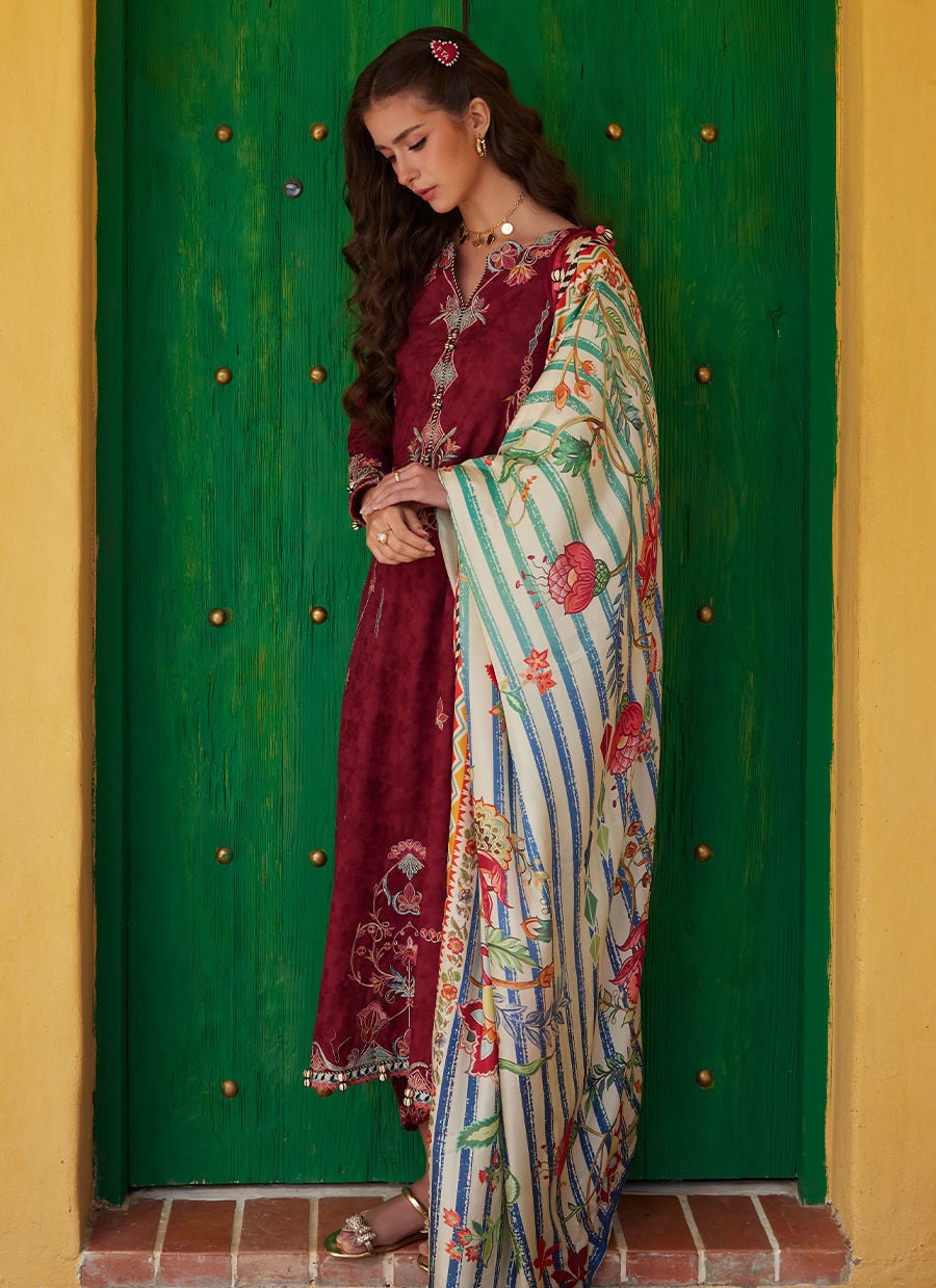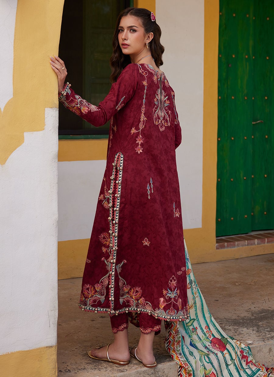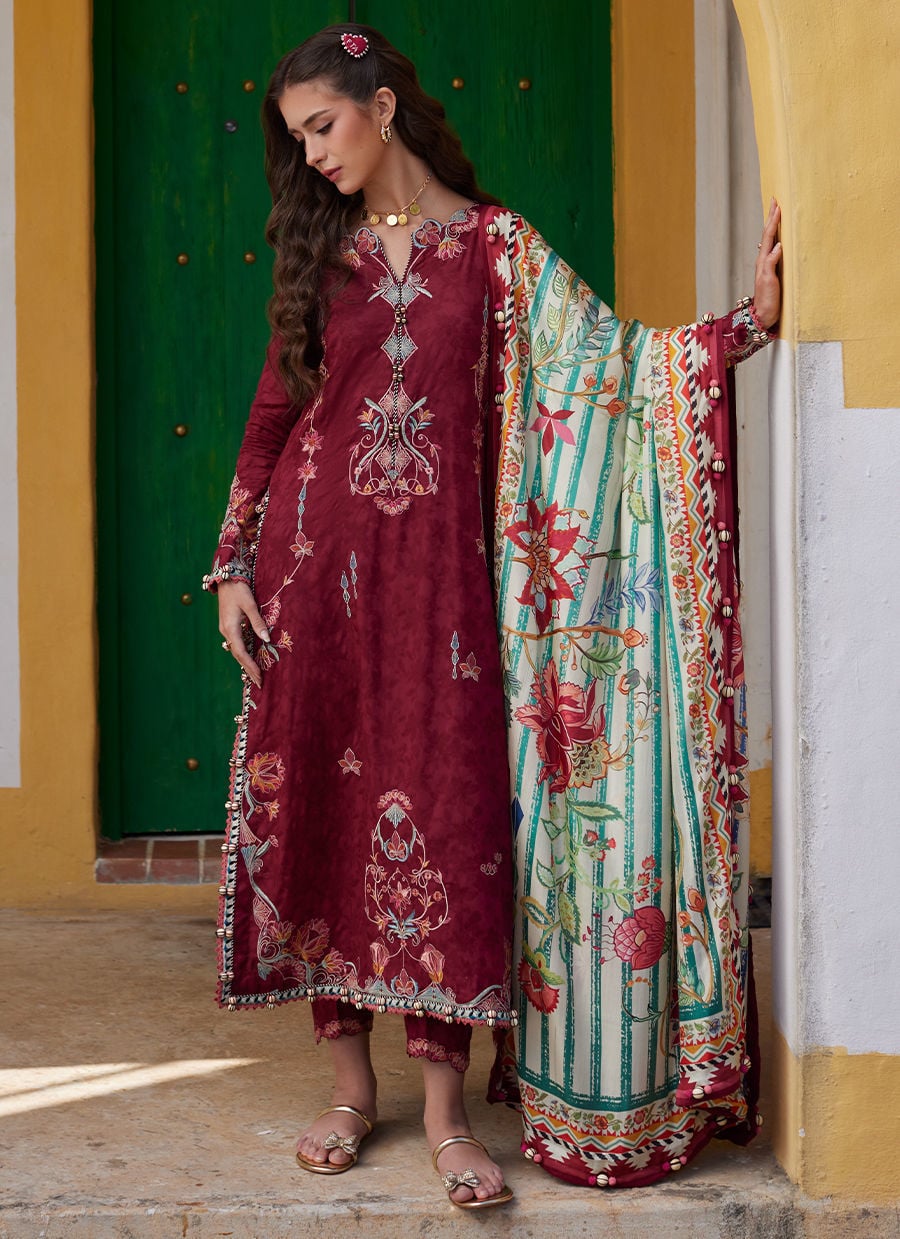 A rich blend of tradition and artful geometry this unstitched lawn ensemble is designed to stand out.The deep maroon lawn shirt is elevated with thick appliqué-inspired embroidery that creates a beautifully structured, almost hand-crafted effect. Intricate threadwork in contrasting tones runs across the neckline, sleeves, and hem, giving it a subtle art deco influence with strong, defined detailing.The look is completed with a high contrast printed dupatta featuring bold borders and striking motifs on a contrasting base adding movement, drama, and a refined statement finish. The detailed border frames the outfit perfectly, making it ideal for both day gatherings and festive evenings.
