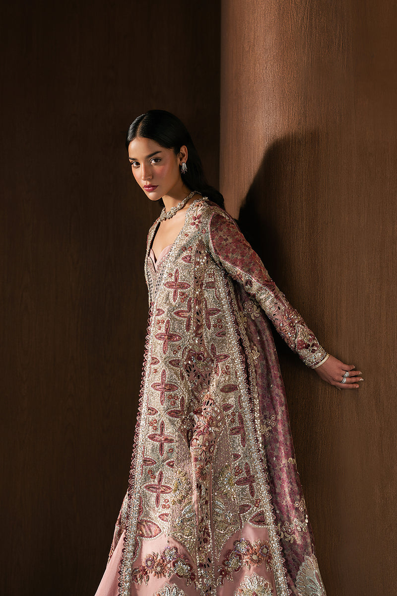 A rose-dust bridal silhouette steeped in old-world grandeur, this ensemble is an ode to heirloom craft. Intricate resham, pearls, and crystals trace botanical and lattice motifs across the long, panelled shirt, flowing seamlessly into a richly embellished sharara that glows with muted gold and berry accents. The soft mauve underlay lends a gentle romance beneath the dense handwork, balancing ornate detailing with quiet femininity.