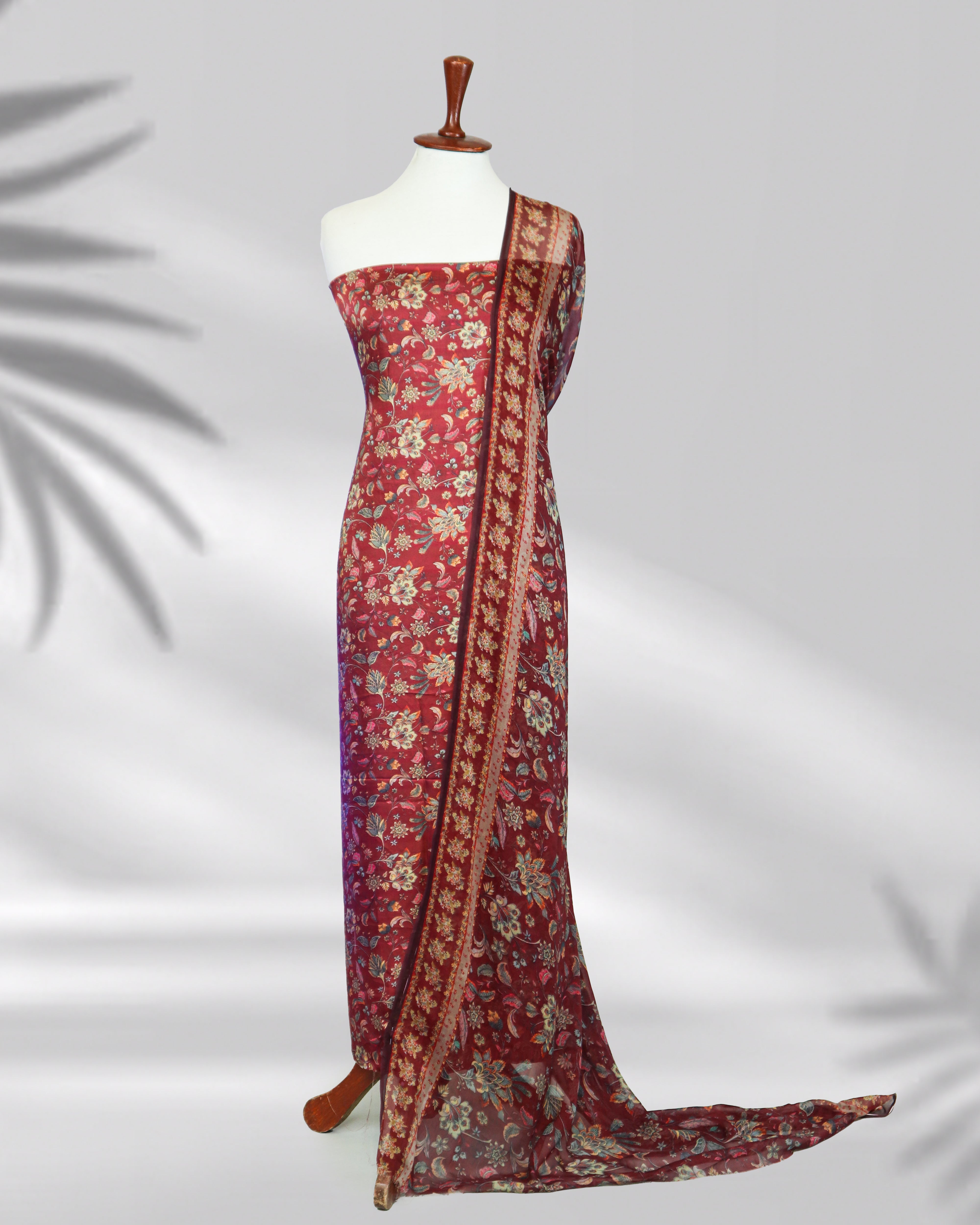 Zafeera embodies timeless sophistication in a rich mehroon hue. Designed on pure silk with refined digital prints, this ensemble is elevated with a light chiffon dupatta that flows gracefully with every step. The perfect harmony of deep color tones and delicate fabric makes it a standout choice for festive occasions, weddings, and evening gatherings.