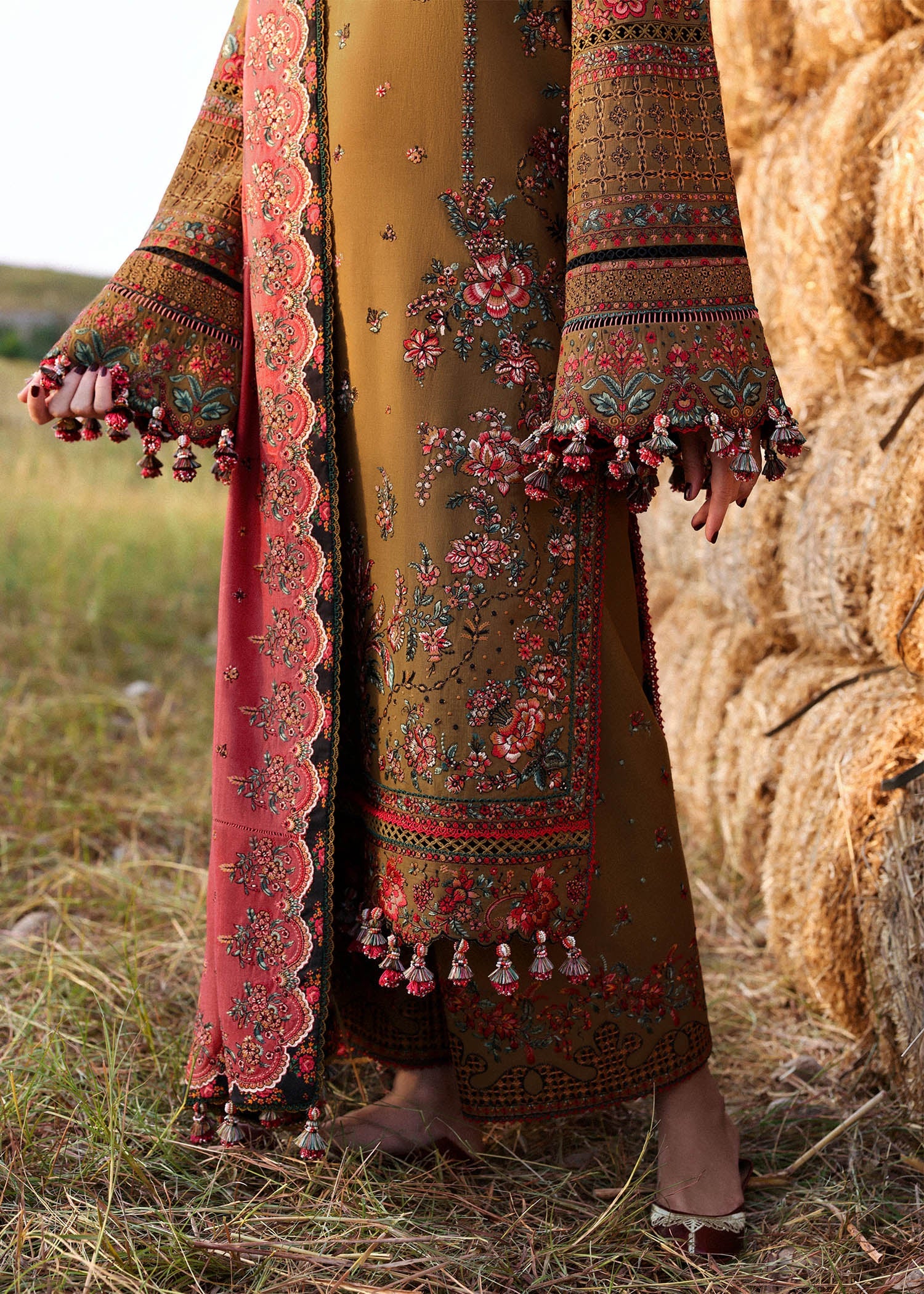 Embrace heritage with this long olive khaddar ensemble, beautifully adorned with a traditional colorful embroidered neckline, composed hem, and delicate spray across the front. The sleeves and hem feature finely embroidered borders, paired effortlessly with stylized embroidered culottes. Completing the look is a contrasting carrot red wool shawl, accentuated with scalloped traditional borders and boti spray — a perfect fusion of warmth, culture, and t imeless elegance.