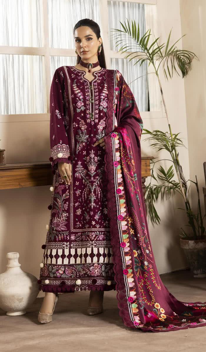 A cozy corduroy embroidered shirt set, designed with a richly embroidered front and sleeves. This outfit is complemented by a twill printed shawl, ideal for a warm winter look. The trousers are dyed corduroy, ensuring a comfortable and stylish fit for colder days.