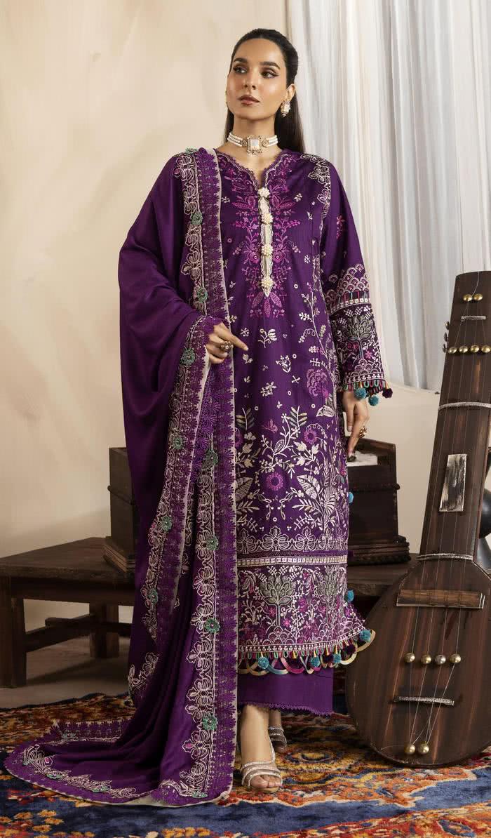 This corduroy ensemble features rich embroidery on the front and sleeves, with a complementing embroidered shawl and patti for a detailed finish. The trousers are dyed to match, ensuring both comfort and warmth during the colder months.
