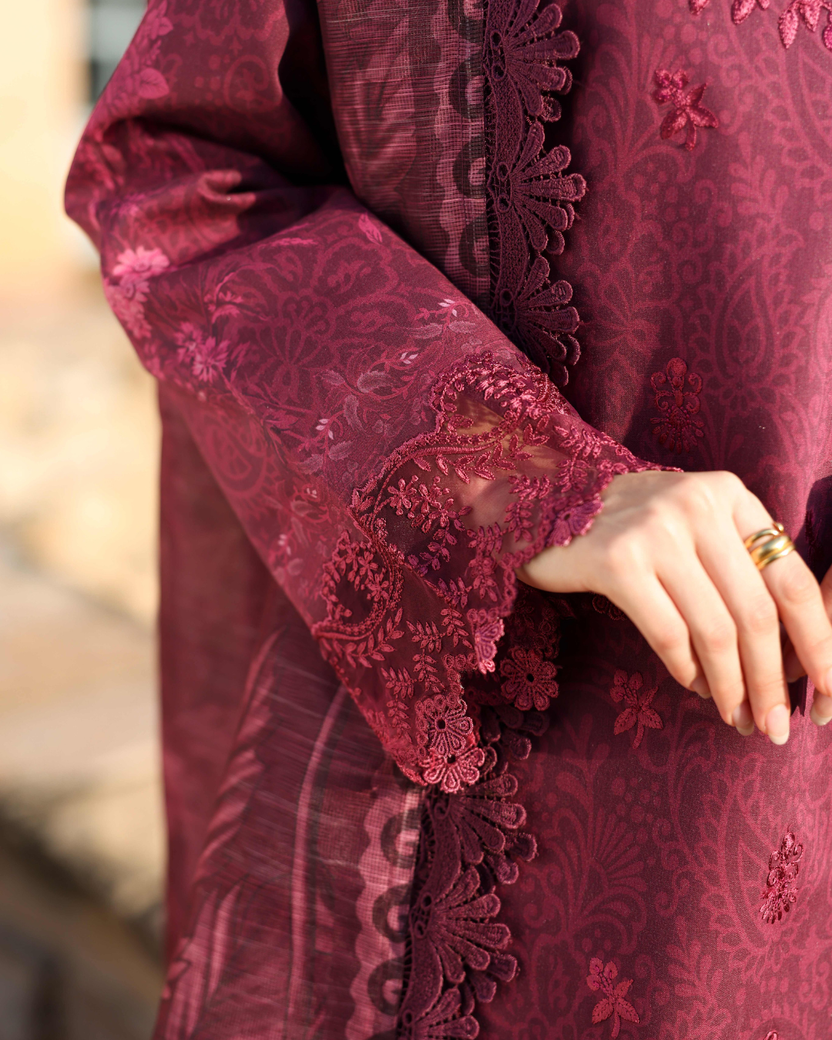 This three-piece lawn suit is designed in a deep, rich burgundy tone, featuring detailed tonal embroidery throughout. The shirt is adorned with delicate cutwork and floral motifs along the neckline, with complementary embroidery on the sleeves and hem. Finished with a matching sheer dupatta carrying coordinated patterns, the ensemble reflects refined detailing and a cohesive design.