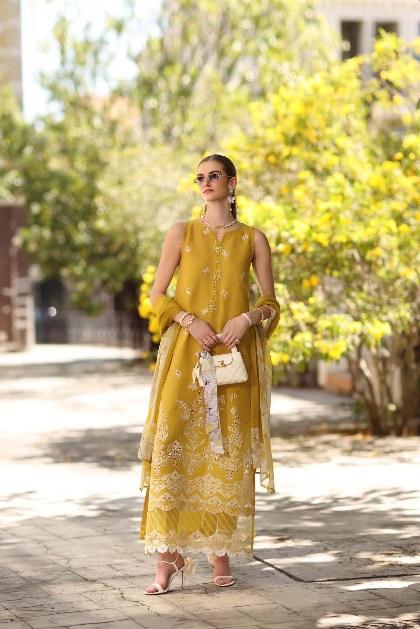 Radiating warmth and festive charm, this striking mustard ensemble is a true celebration of refined craftsmanship. Designed in a rich sunlit mustard hue, the outfit beautifully captures the spirit of Eid with its graceful balance of tradition and modern sophistication. The shirt features an intricately detailed embroidered schiffli front, delicately adorned with shimmering sequins that catch the light with every movement. The hemline is elevated with ornate lacy borders, intricately designed to frame the outfit with timeless femininity. These lace details add softness and dimension, making the silhouette appear both structured and flowy. The airy dupatta, flowing in a soft mustard tone with delicate printed floral border, adds movement and grace, completing the ensemble with an ethereal touch.