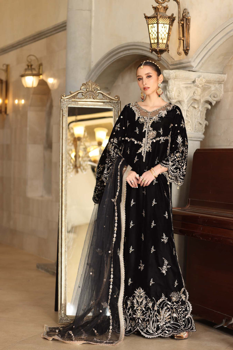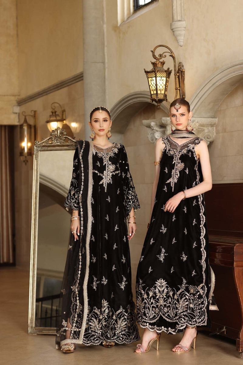 The ensemble is paired with an intricately embroidered net dupatta, adorned with delicate borders that exude refined elegance. The soft shimmer of threadwork against the deep black velvet creates a captivating balance of opulence and subtlety, a design made to enchant at every festive and formal occasion