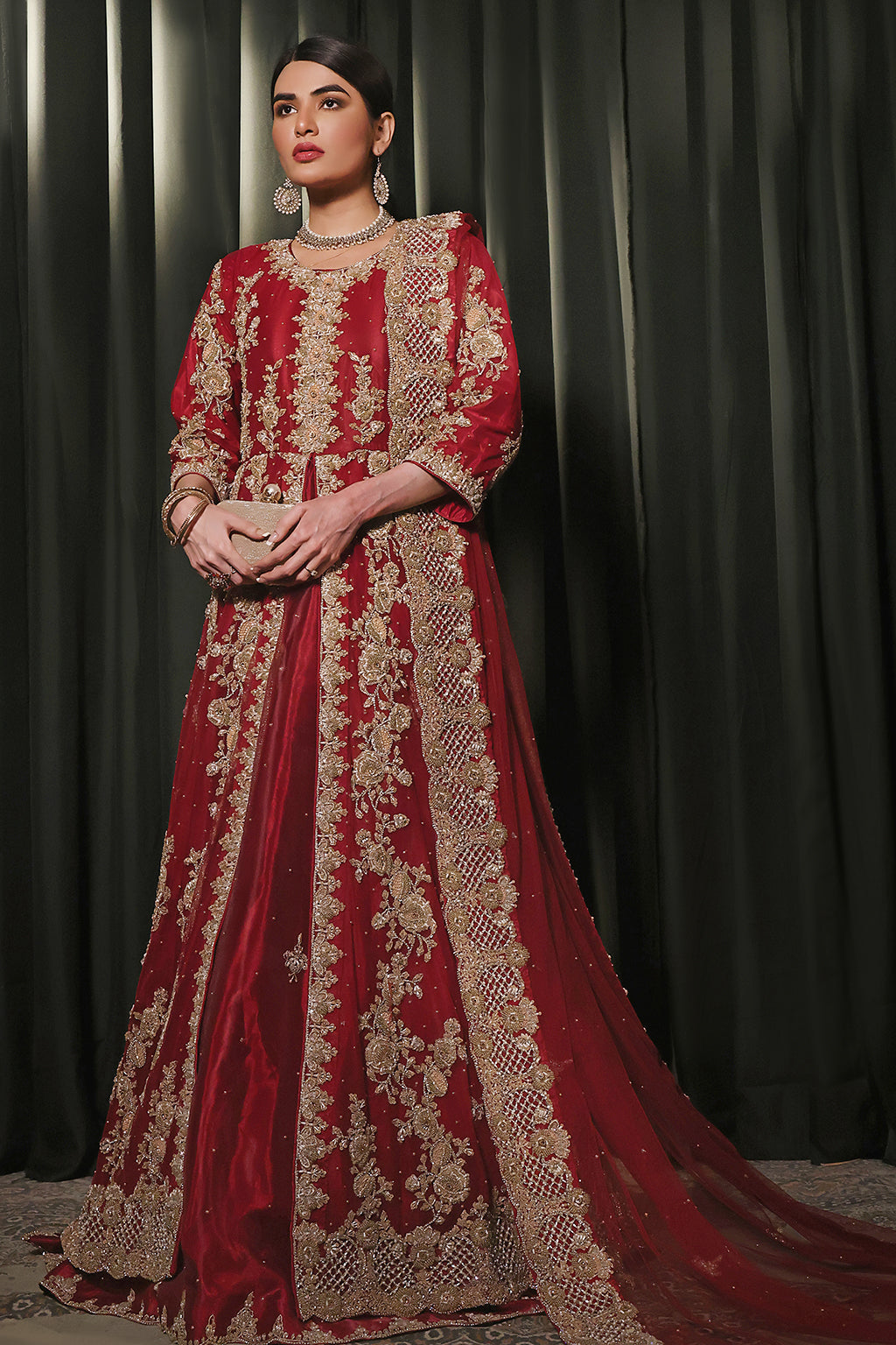 Color:Red Work Details: Hand Embellished Most dignified and traditional front open kalidar in dark red color, embellished with zardozi and silk. Intricate embroidery with traditional details and done on a floral theme, it is paired with a classic rust hand-crafted misiki for a traditional bride. Fabric details Maxi and dupatta in net organza