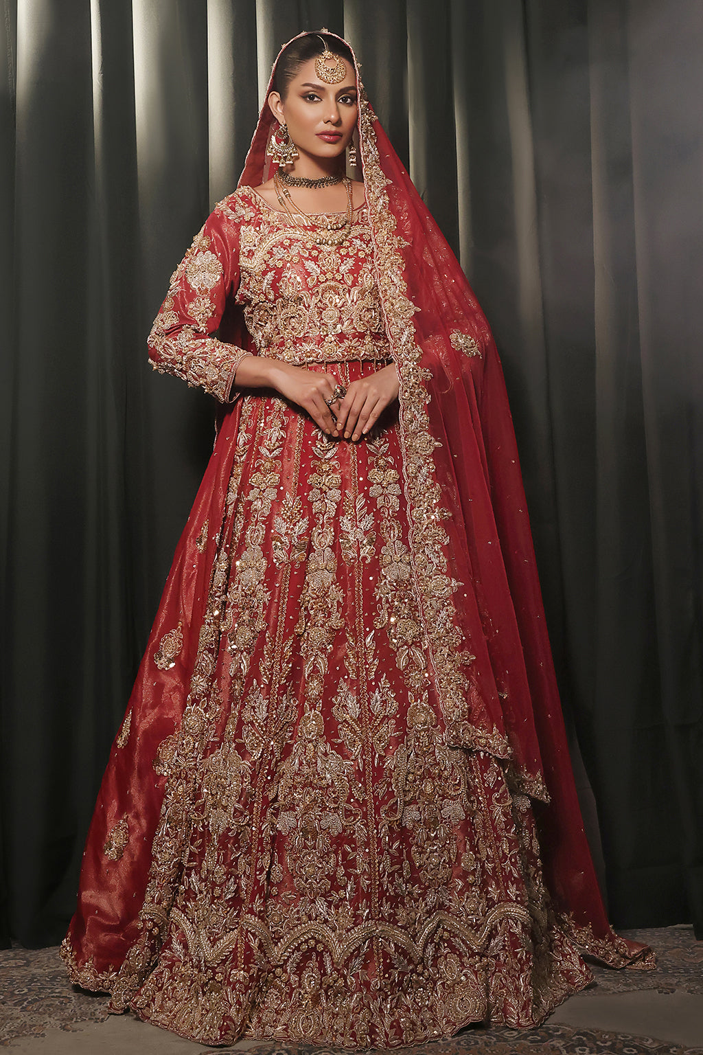 Color:Red Work Details: Hand Embellished Choli. Lehenga. Veil. This traditional lehenga and choli is crafted in organza with gold embellishments, paired with a net veil with intricate embroidery. Fabric Details Lehenga and choli in organza, veil in net.