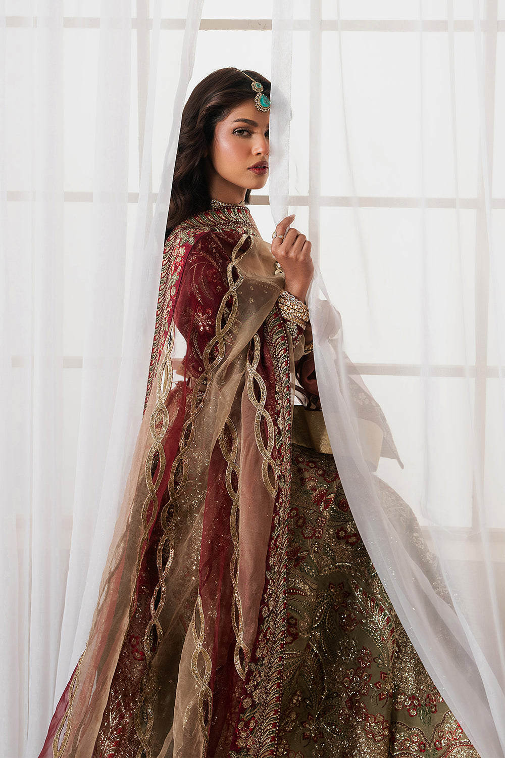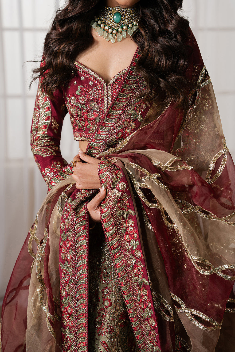 A majestic celebration of heritage and grandeur, this lehenga ensemble unfolds in rich crimson and antique gold tones that radiate regal elegance. The intricately embroidered blouse is adorned with ornate threadwork and fine embellishments that sculpt the silhouette with striking precision. The lehenga flows with dramatic volume, enriched with elaborate traditional motifs and dense embroidery that create depth, texture, and timeless opulence. Complemented by a luxurious dupatta layered with intricate borders and luminous detailing, the ensemble drapes with effortless sophistication. Designed for moments that demand statement elegance, this look embodies classic bridal grandeur infused with contemporary refinement.