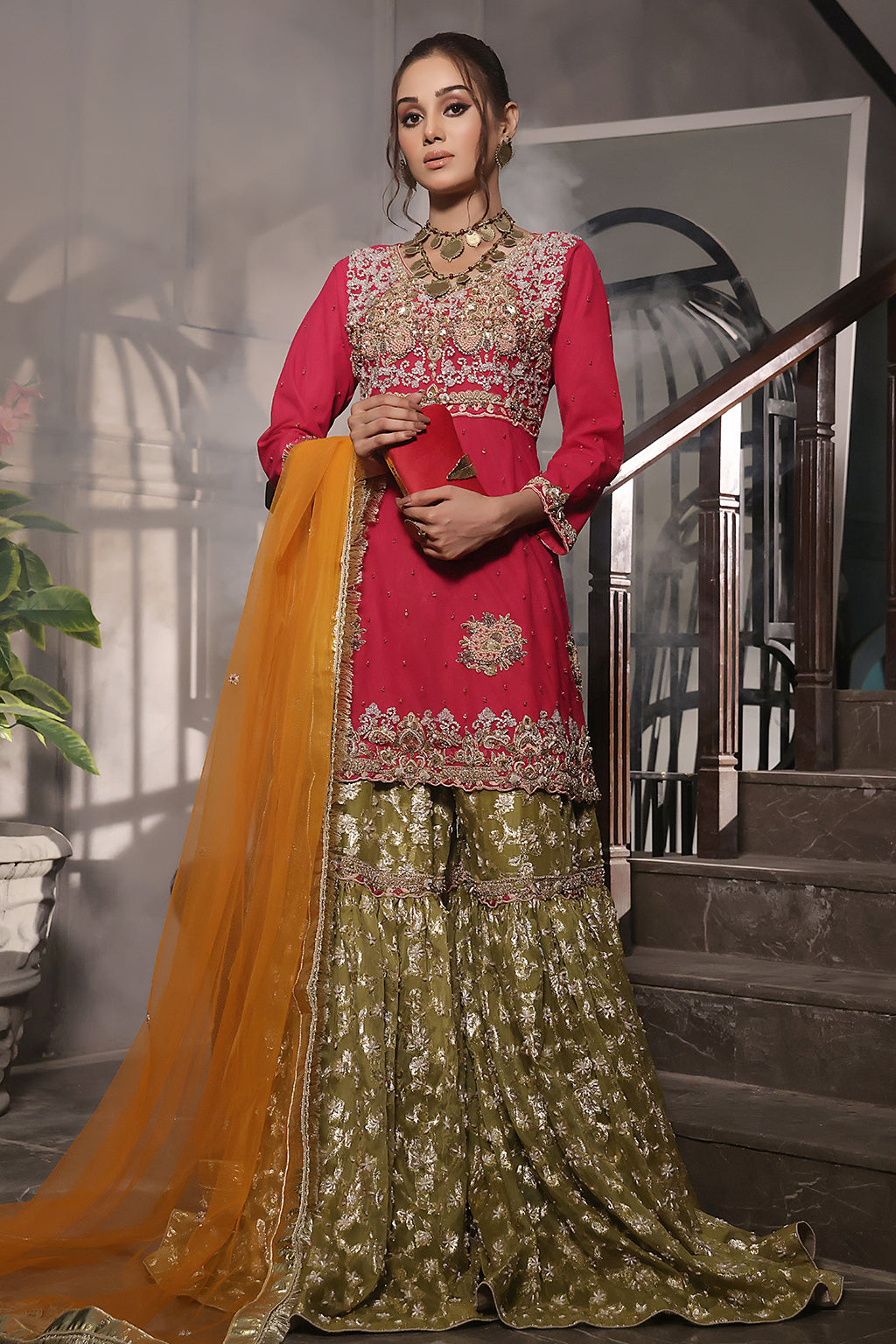 Colors: Pink Frock..Dupatta Orange And Gharara Dhaani colour