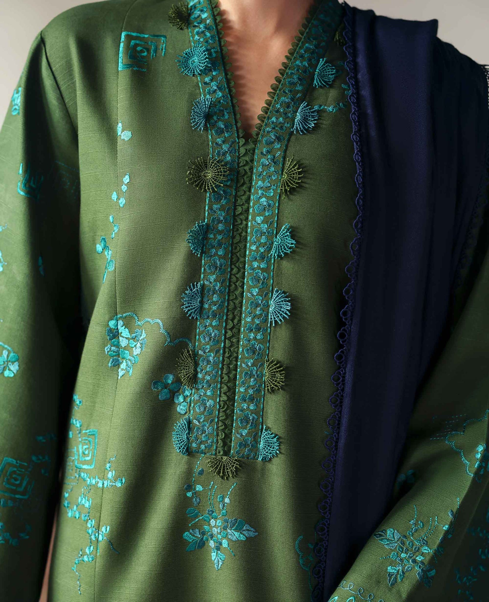 This parrot green khaddar shirt is embellished with green satin floral stitch embroidery, adding subtle texture and elegance. It is paired with a green and blue-toned jacquard shawl, creating a striking yet balanced contrast for a refined winter look.