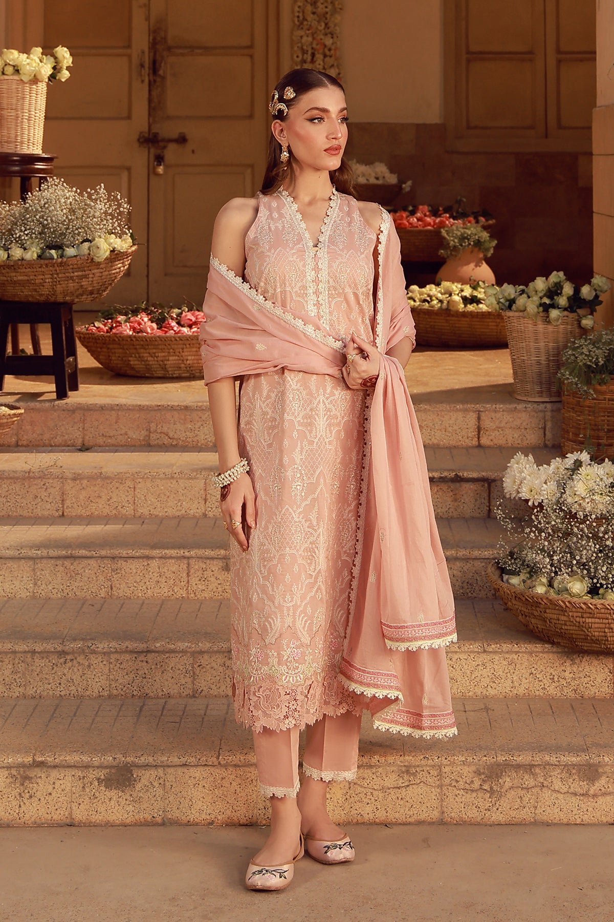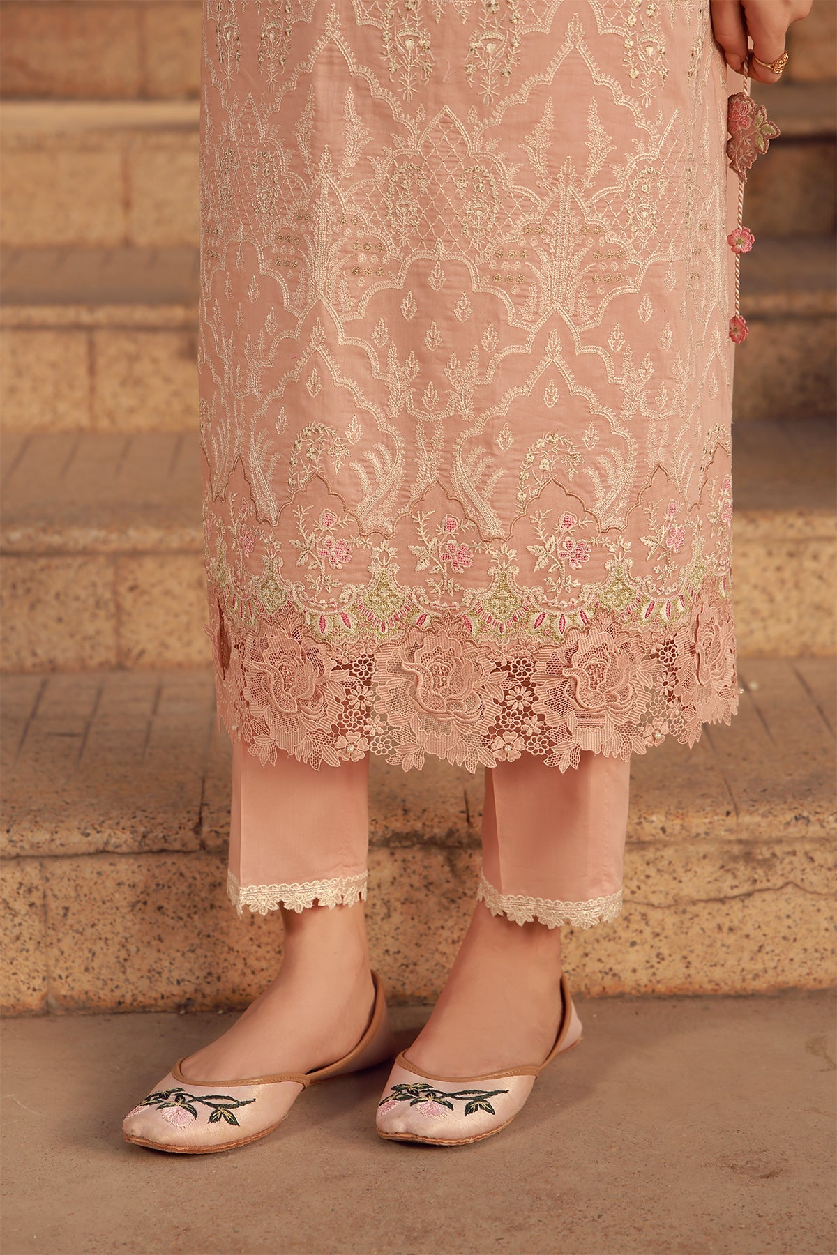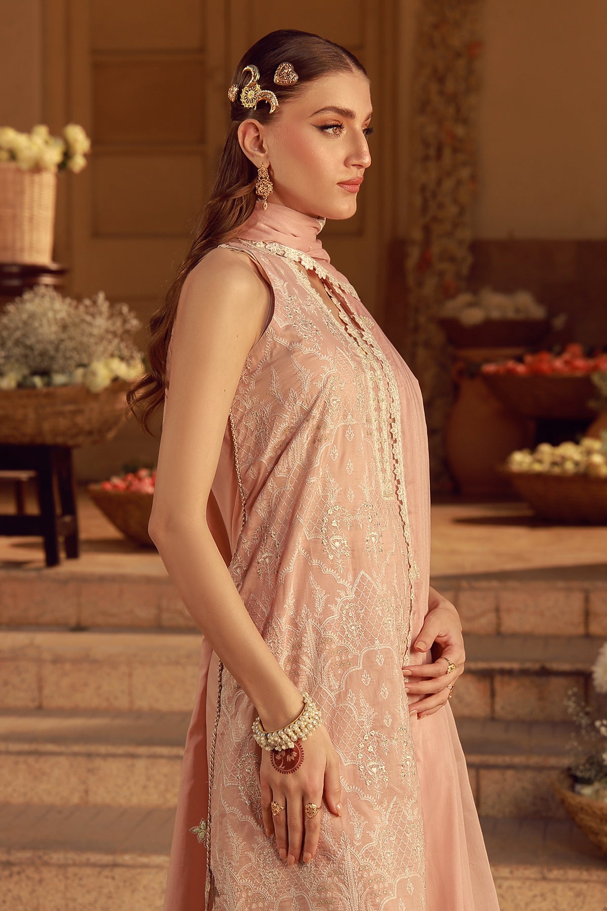 Exude timeless elegance in this soft blush pink ensemble, designed with delicate craftsmanship and fluid grace. The sleeveless silhouette is adorned with intricate tonal embroidery, creating a subtle yet luxurious texture throughout. A sheer, flowing dupatta edged with fine lace drapes effortlessly over the shoulders, adding movement and ethereal charm to the look. Perfect for festive evenings, intimate celebrations, or formal daytime occasions, this ensemble balances classic femininity with modern sophistication.