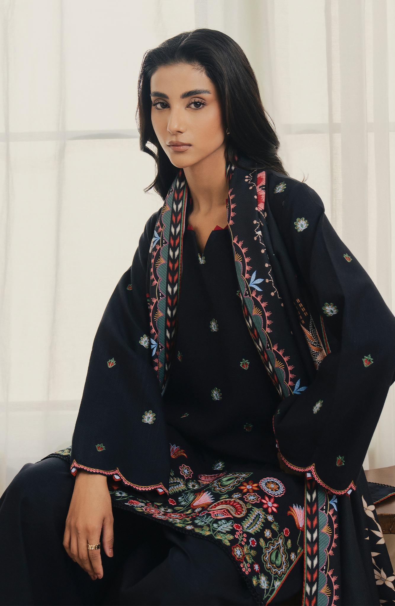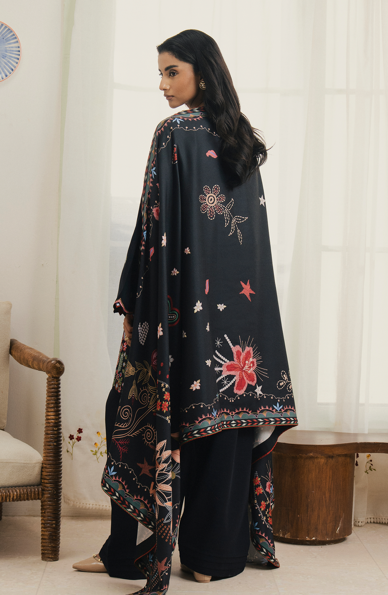 Bold and enchanting, Nythea unfolds in a deep midnight black, brought to life with vibrant multicolored embroidery. This unstitched slub khaddar shirt features scattered motifs across the front and intricately worked florals blooming along the hem in striking shades of red, green, teal, and pink. Delicate scalloped sleeve edges add a refined finishing touch. Paired with a matching slub khaddar trouser for effortless winter comfort, the look is elevated with a blended printed shawl showcasing bold, artistic motifs and rich borders. A perfect harmony of color, craft, and character — Nythea is winter artistry at its finest.