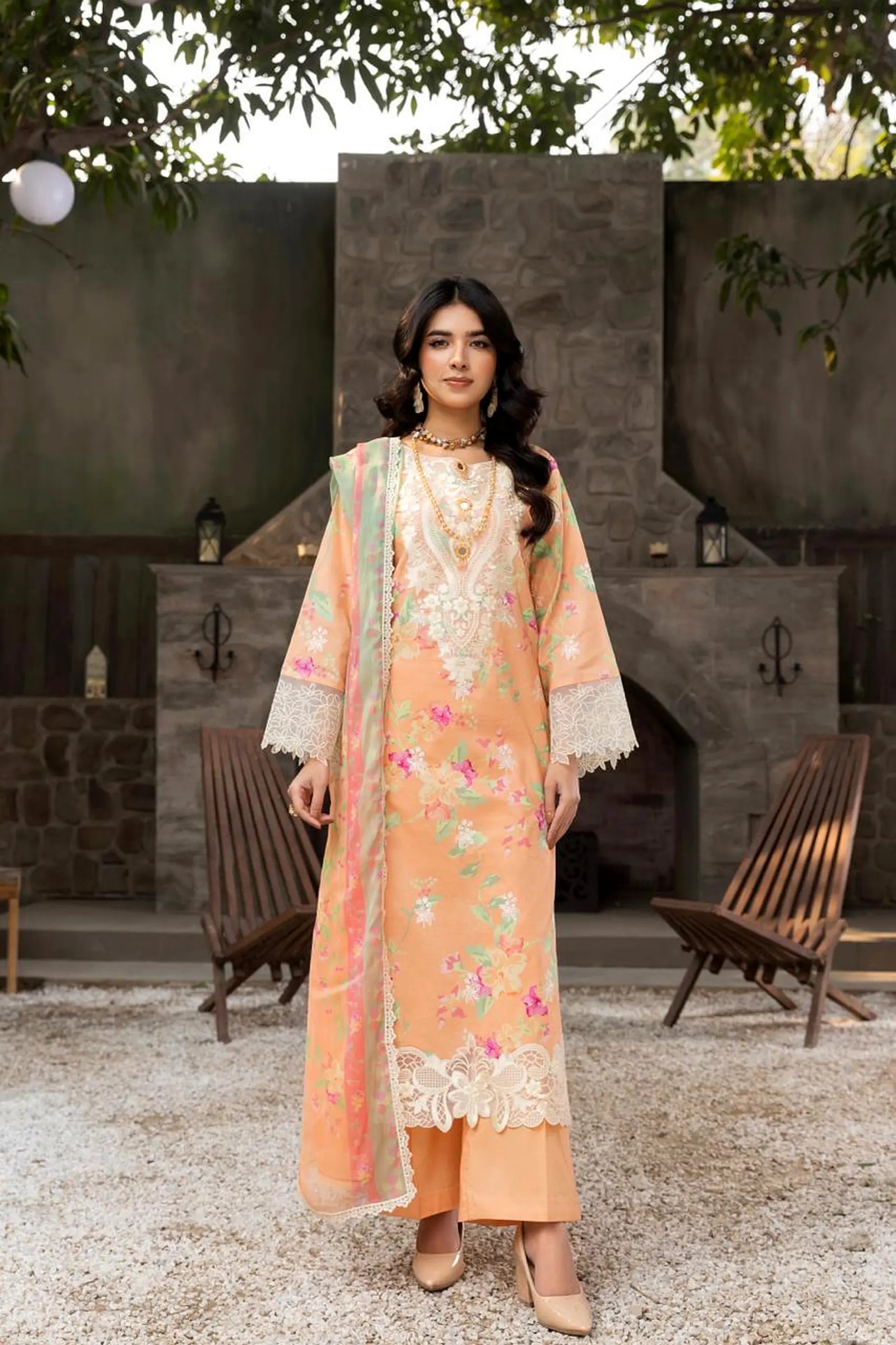 UNSTITCHED PACKAGE INCLUDE: Print + emb lawn frnt fabric Print lawn saleves fabric Printed lawn back fabric Emb front neckline Emb selves border Dyed cotton trouser Bamber chifoon printed dupatta Emb shirt front and back border patch