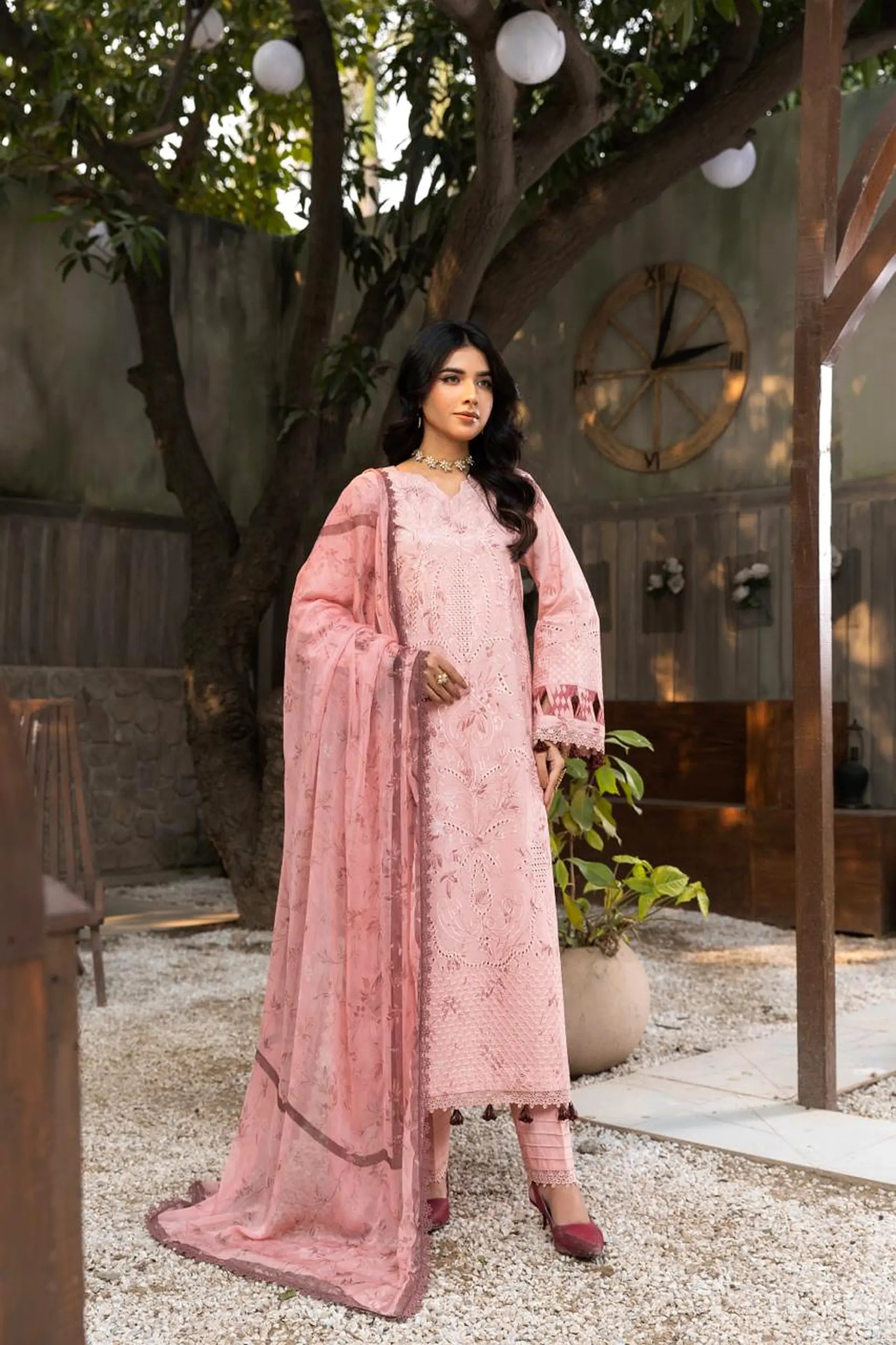 UNSTITCHED PACKAGE INCLUDE: Print + emb lawn frnt fabric Print lawn saleves fabric Printed lawn back fabric Emb front neckline Emb selves border Dyed cotton trouser Bamber chifoon printed dupatta Emb shirt front and back border patch