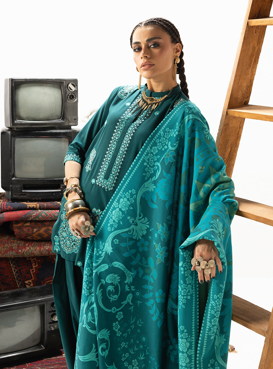 Kyana is a statement of unparalleled depth and luxury, captured entirely in the most mesmerizing jewel tones. The flowing Marina Twill ensemble is drenched in a profound emerald green, providing the ideal backdrop for intricate, tonal embroidery in teal and lighter jade hues. The complex motifs cascade across the suit and onto the matching Lenzing Ecovero shawl, creating a seamless, ethereal silhouette that trails elegantly. This monochromatic masterpiece emphasizes artisanal craftsmanship and regal grace.